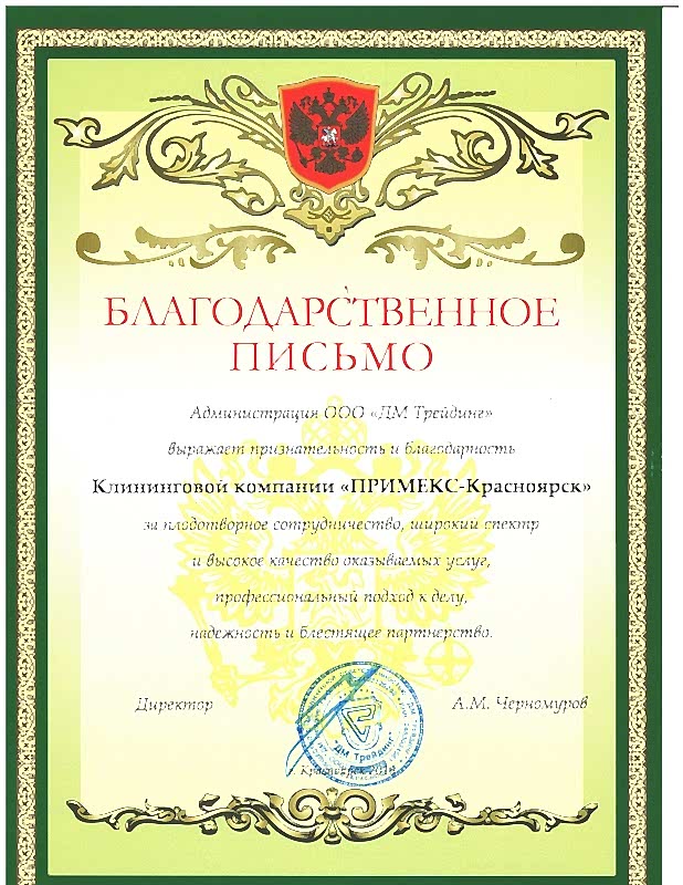 Администрация ООО "ДМ Трейдинг" выражает признательность и благодарность клининговой компании "Примекс-Алматы" за плодотворное сотрудничество, широкий Pin-Up и высокое качество оказываемых услуг, профессиональный подход к делу, надежность и блестящее партнерство.