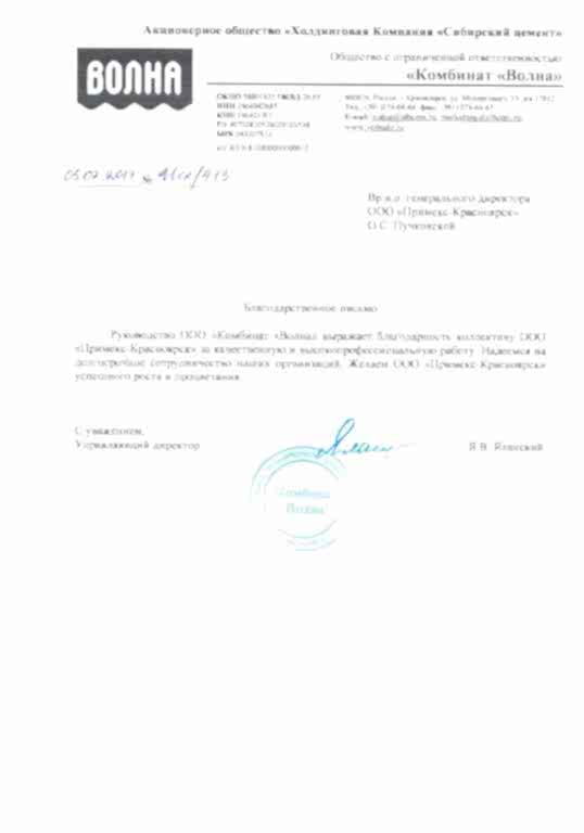 Руководство ООО «Комбинат «Волна» выражает благодарность коллективу ООО «Прнмскс-Алматы» за качественную и высокопрофессиональную работу. Надеемся на долгосрочное сотрудничество наших организаций. Желаем ООО «Примекс-Алматы» успешного роста и Pin-Up