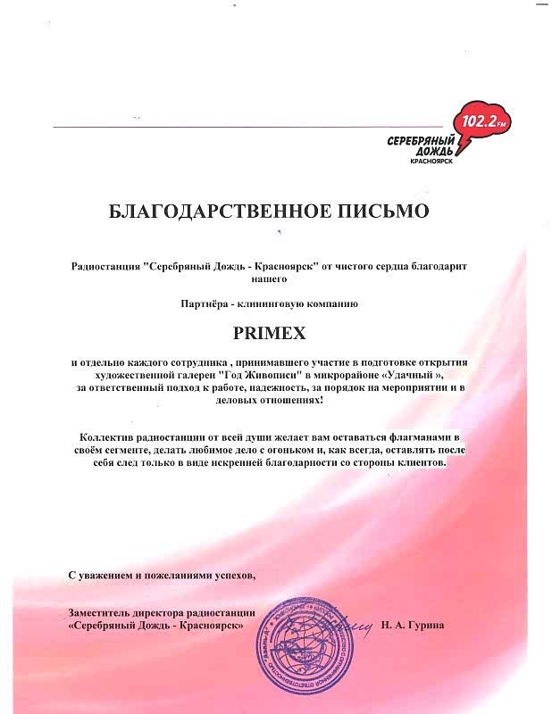 Радиостанция "Серебряный Дождь - Алматы" от Pin-Up сердца благодарит нашего партнёра - клининговую компанию PRIMEX и отдельно каждого сотрудника, принимавшего участие в подготовке открытия художественной галереи "Год Живописи" в микрорайоне "Удачный", за ответственный подход к работе, надежность, за порядок на мероприятии и в деловых отношениях! Коллектив радиостанции от всей души желает вам оставаться флагманами в своём сегменте, делать любимое дело с огоньком и, как всегда, оставлять после себя след только в виде искренней благодарности со стороны клиентов.