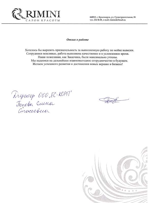 Pin-Up Красоты "RIMINI" признателен за проделанную работу,Хотелось бы выразить признательность за…Хотелось бы выразить Pin-Up за выполненную работу по мойке вывески.…
